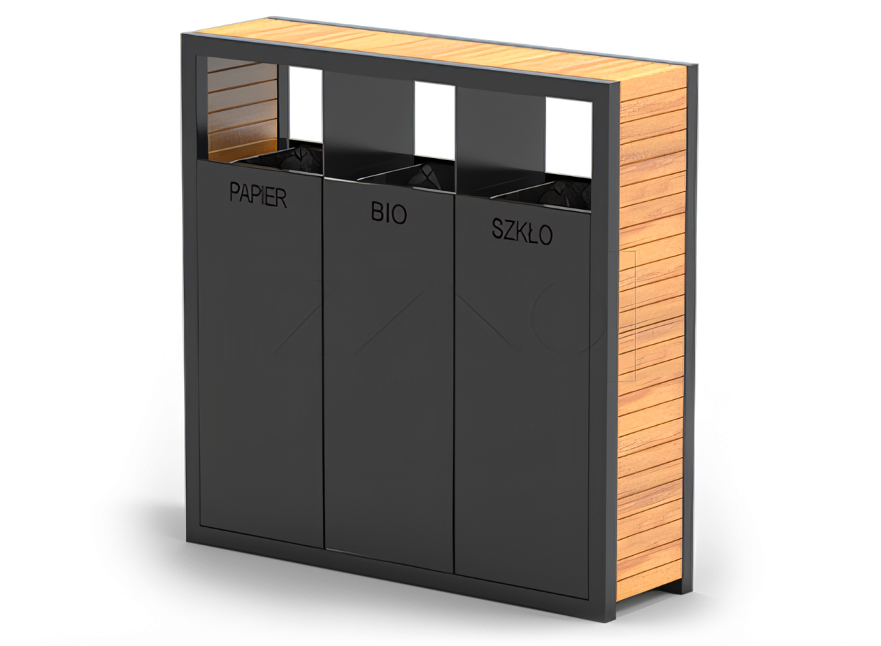 Recycling is a morally responsible decision that is easy to organize if you have optimal recycling bins for your city surroundings. ZANO Street Furniture recycling bins were designed to protect our environment and add a beautiful aesthetic to any streetscape. Presented Pavo recycling bin is a modern project made of high quality wood and carbon steel construction. It has a special colourful communication, which facilitate uncomplicated recycling. This environmentally friendly recycling bin has also a contemporary look, based on the highest quality materials. Thanks to the container’ triple design and special visual communication, ordering rubbish is really simple and fast.