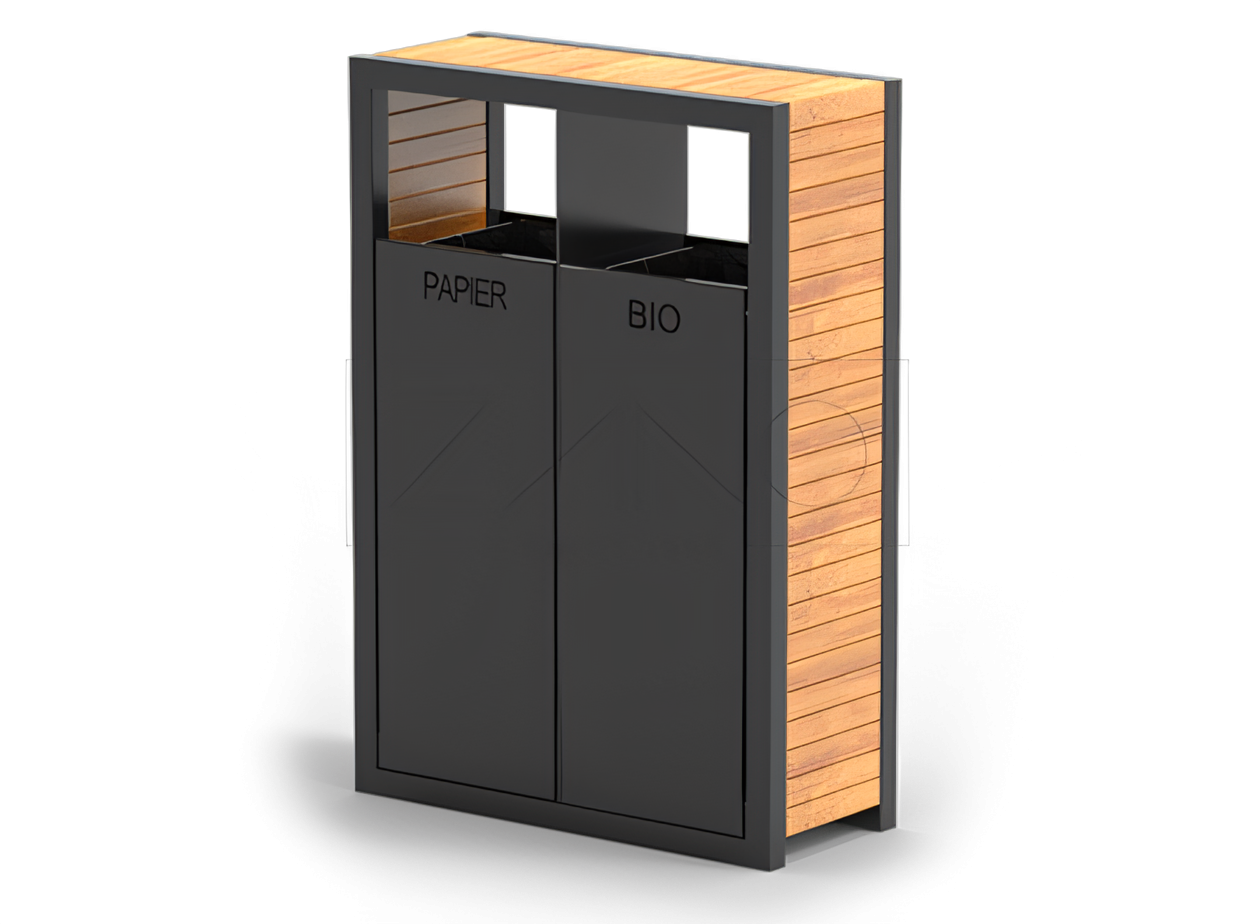 The Pavo 15.263 double compartment recycling bin is a solid urban bin with a modern, universal design, elaborated with attention to the smallest details. Construction - is made of steel with a wooden finish. Choose between carbon steel, galvanised and powder-coated in a RAL colour of your choice, or stainless steel. The wood can be softwood, twice lacquered in the colour specified by the customer, or hardwood (protected by oiling). Alternatively to wood we can use HPL or the bin can be entirely made of steel. Inserts - The bin has two inserts made of galvanised sheet metal. Access to them is convenient by tilting the front part of the basket. Methods of installation - The basic way of fixing the basket is by screwing it to the foundation. Order customisation - inscriptions can be cut into the bin according to purpose (e.g. paper, metal, mixed), in stainless steel we can etch information or a logo. A sticker may be placed on the bin.
